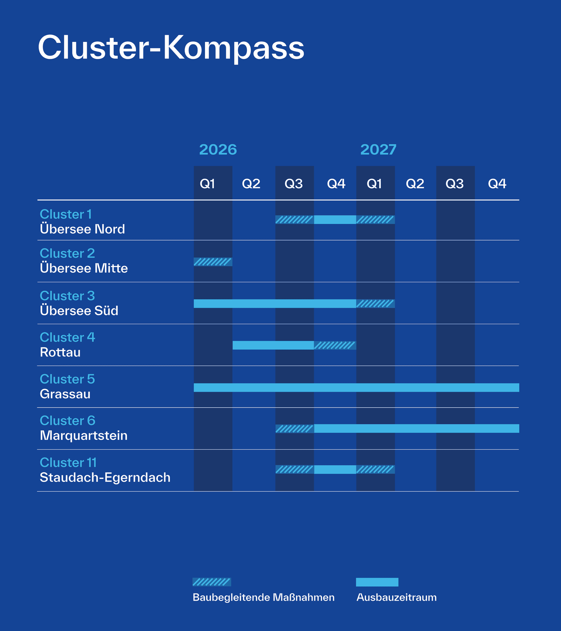 AVACOMM realisiert den eigenwirtschaftlichen Glasfaserausbau im Achental. Ziel ist eine flächendeckende, zukunftssichere Internetinfrastruktur für private Haushalte und Betriebe – ohne finanzielle Belastung für die Kommunen. Das Ausbauprojekt umfasst rund 250 Kilometer Glasfasertrasse und die Anbindung von über 7.500 Gebäuden in den Gemeinden Übersee, Grassau, Rottau, Marquartstein, Staudach-Egerndach, Unterwössen, Schleching und Reit im Winkl.