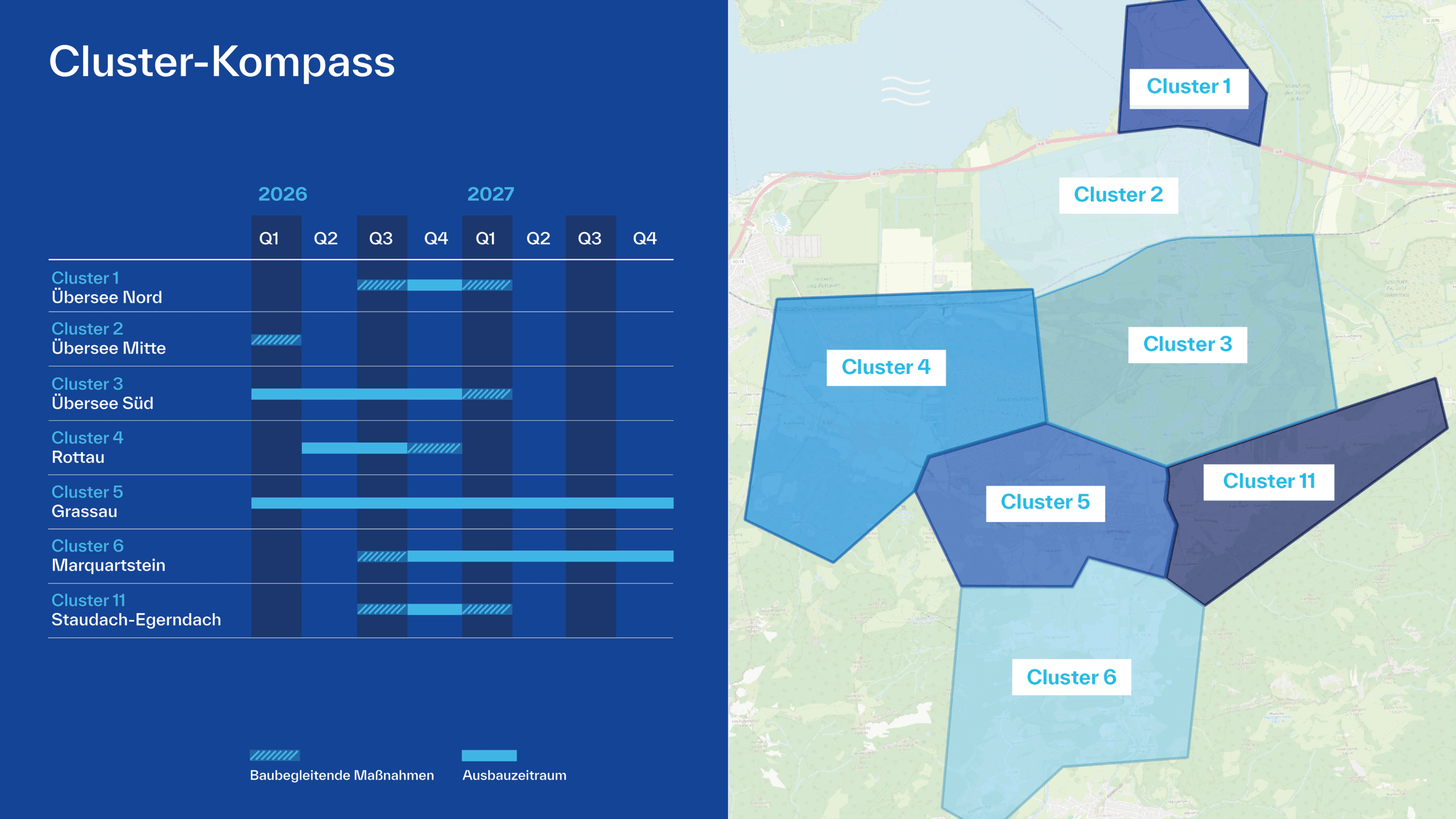 AVACOMM realisiert den eigenwirtschaftlichen Glasfaserausbau im Achental. Ziel ist eine flächendeckende, zukunftssichere Internetinfrastruktur für private Haushalte und Betriebe – ohne finanzielle Belastung für die Kommunen. Das Ausbauprojekt umfasst rund 250 Kilometer Glasfasertrasse und die Anbindung von über 7.500 Gebäuden in den Gemeinden Übersee, Grassau, Rottau, Marquartstein, Staudach-Egerndach, Unterwössen, Schleching und Reit im Winkl.